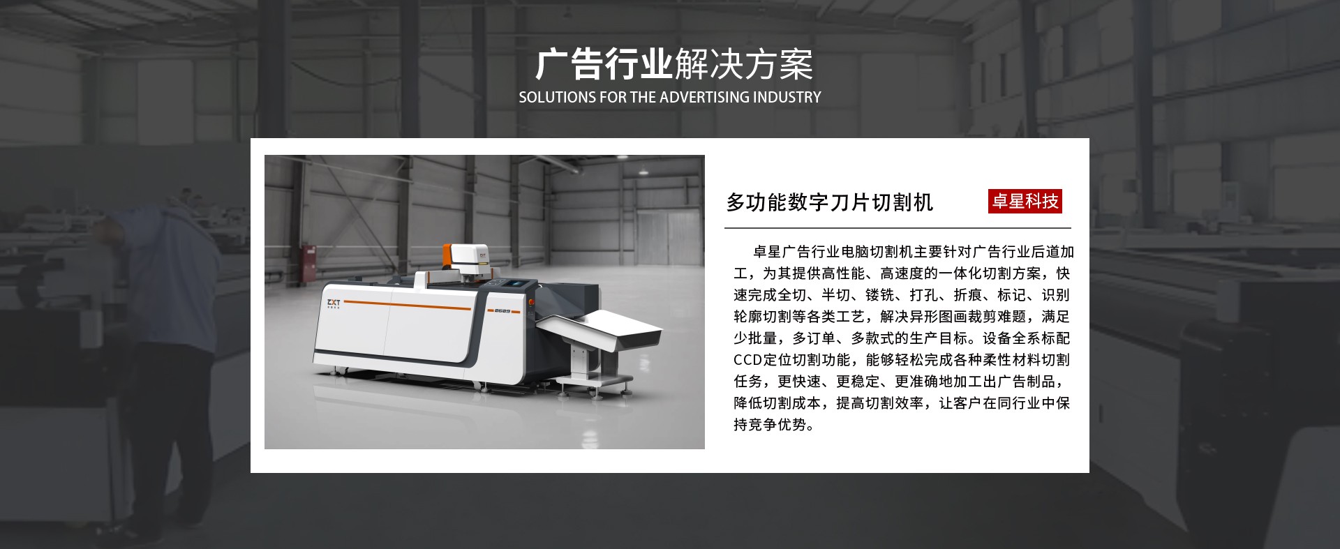 卓星廣告行業電腦切割機主要針對廣告行業后道加工,為其提供高性能、高速度的一體化切割方案,快速完成全切、半切、鏤銑、打孔、折痕、標記、識別輪廓切割等各類工藝,解決異形圖畫裁剪難題,滿足少批量,多訂單、多款式的生產目標。設備全系標配CCD定位切割功能,能夠輕松完成各種柔性材料切割任務,更快速、更穩定、更準確地加工出廣告制品,降低切割成本,提高切割效率,讓客戶在同行業中保持競爭優勢。